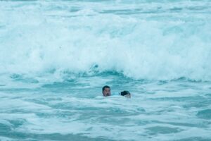 Notre jeune chargeur casse son leach, sur un énorme set avant le début de la série, et sa planche finie concassée dans les block.